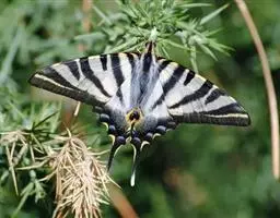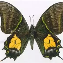 形态 成虫:翅展70 mm左右。体黑色,胸部背面有白点及条纹。翅黑褐色,前翅中室内有4条斜带及2个斑,外缘区有1列小斑;中室端外有4—5个斑点,其余都是纵条斑带,排列与纹凤蝶相似。后翅近三角形,外缘较直略呈波状,基部的2/3是纵条斑带,外缘区有1列新月形斑,亚臀角有黄斑点。翅反面棕褐色,斑纹与正面相似。