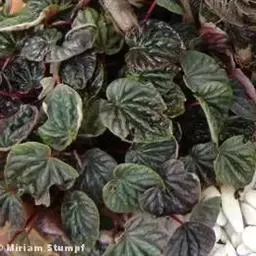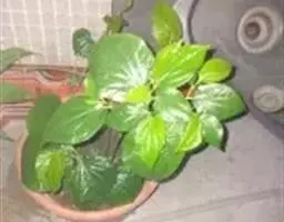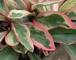 花叶椒草 也称斑叶椒草,为圆叶椒草的栽培变种。植株直立生长,短茎红褐至绿褐色,肉质。叶宽卵形,质厚,长5厘米至12厘米,宽3厘米至5厘米,绿色,有黄白色斑纹,边缘犹为 圆叶椒草 明显。