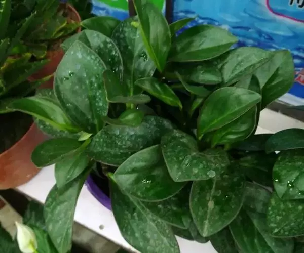 多年生常绿草本。株高25cm,冠径25cm。叶革质,淡绿色。穗状花序,白色。茎直立性,单叶生有柄,叶倒卵形、全缘,长、宽约3-6公分,叶面光滑浓绿,叶质肥厚。