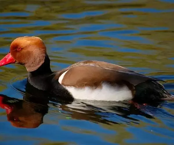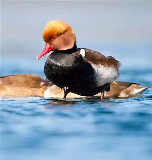赤嘴潜鸭(学名:Netta rufina)俗称大红头,是大型鸭类,个体比绿头鸭小,体长45-55厘米,体重1千克左右。雄鸟头浓栗色,具淡棕黄色羽冠。上体暗褐色,翼镜白色,嘴赤红色。下体黑色,两胁白色,特征极明显,野外容易辨别。雌鸟通体褐色,头的两侧、颈侧以及颏和喉灰白色,飞翔时翼上和翼下大型白斑极为醒目。栖息在开阔的淡水湖泊、水流较缓的江河、河流与河口地区,也常出现在公路两侧的水泡中,特别是有水边植物和水较深的淡水湖泊最为喜欢。主要通过潜水取食,也常尾朝上、头朝下在浅水觅食。觅食多在清晨和黄昏。食物主要为水藻、眼子菜和其他水生植物的嫩芽、茎和种子,有时也到岸上觅食青草和其他一些禾本科植物种子或草子。主要分布于欧洲中部、亚洲中部,从多瑙河流域经土耳其、黑海、里海、吉尔吉斯到西西伯利亚,往南到蒙古西部、伊朗、叙利亚北部,也有少量繁殖在西班牙东部、法国南部、欧洲北部,一直到丹麦、荷兰。