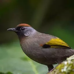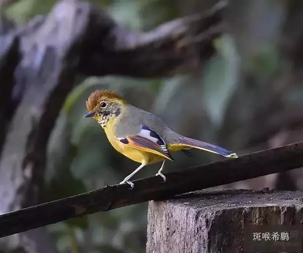 斑喉希鹛(学名:Minla strigula)小型鸟类,体长14~17厘米。头具羽冠,前额和头顶羽冠金黄褐色,头侧灰黄色具黄色眼圈。上体灰橄榄绿色,外侧飞羽表面橘黄色、基部具黑色翼斑;内侧飞羽表面淡灰色具黑色亚端斑和白色端斑。尾羽黑色,基部栗色,羽缘和羽端黄色。颊黑色,颏橘黄色,喉白色具黑色横斑,其余下体淡黄色。特征突出,容易识别。中国还未见有与之相似的种类。