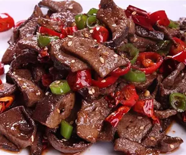 3、炒勺烧热往油,油热后先下辣椒、花椒,炸至黑紫色,再下猪肝片,待肝熟透即速注汁入勺,汁开后稍翻炒,滴醋,并加入炸花生米即成。