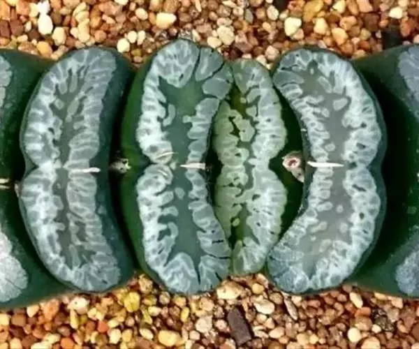 植株低矮无茎,叶片肉质直立,往两侧直向伸长,稍向内弯,对生,排列于两方,呈扇形,顶部略凹陷,呈截面状,总状花序,花茎长20~25厘米,花筒状,白色,中肋绿色,长1.5厘米。看起就好像有人用刀子切过一样。表面粗糙,绿色至暗绿褐色,有小疣状突起。新叶的截面部分透明,呈灰白色。