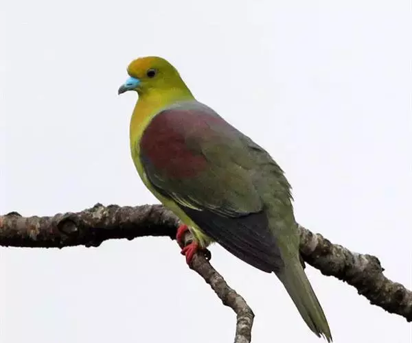 为国内最大的一种绿鸠;第三枚飞羽的内翈亦有凹入处,但前三枚飞羽先端形甚狭尖;羽色与一般绿鸠迥异;上体以黄橄榄绿色为主,下体以淡蓝灰色为主;两性均有紫红色翅斑而无背斑,雌雄同色。