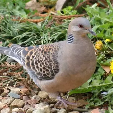 山斑鸠,是鸽形目鸽鸠科斑鸠属鸟类,又名金背斑鸠、棕背斑鸠、山鸠、金背鸠、麒麟斑、麒麟鸠、东方斑鸠、绿斑鸠、山鸽子。山斑鸠颈侧具明显黑白色条纹的块状斑,上体深褐色、具扇贝状斑纹,羽缘棕色,尾羽近黑色,下体多偏粉色。虹膜黄色,喙灰色,脚粉色。山斑鸠是留鸟,在中国常见且分布广泛。此外,还分布于不丹、尼泊尔、巴基斯坦、印度、日本等国。栖息于针阔混交林、季风常绿阔叶林、果园及农耕区,多成对活动于开阔农耕区、村舍、寺院周围及防火林带。取食于地面,主要觅食植物种子、果实、嫩芽等,也吃昆虫。山斑鸠飞翔时鼓翼快速,叫声为反复而低沉的“咕咕咕”声。繁殖期在4-7月,营巢于林中树上,通常一年繁殖2窝,窝卵数2枚,由雌雄亲鸟轮流孵卵,孵化期18~19天。山斑鸠的肉、卵可食,肉入药可益气明目、强筋壮骨,治久病气虚、衰弱无力、两目昏暗等病症。山斑鸠啄食杂草种子,对农田清除杂草有益;但有时也刨食农作物及树的种子。山斑鸠