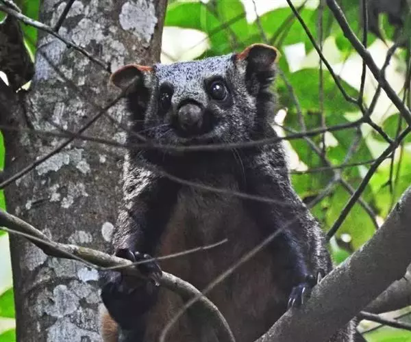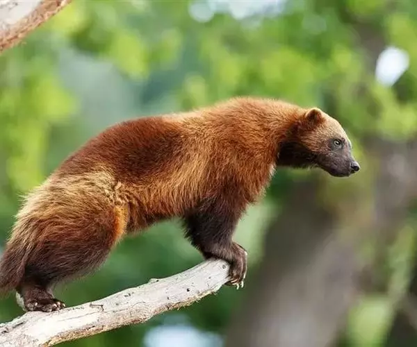 貂熊是现存最大的陆生鼬科动物,貂熊在身体外形上介于貂与熊之间,身体和四肢粗壮像熊,但有一条长尾则象貂。身体不大, 体型粗壮,连头带尾长约80~100厘米,尾长18厘米左右,体重达8~25千克。毛被棕褐色,体侧向后沿臀周有一淡黄色半环状宽带纹,状似“月牙”,故有“月熊”之称; 由于两肋至后腿根部的毛延长,长度可达12厘米,如同围着一圈长长的“毛裙子”,加上它蓬松的尾毛,在密林中自由跳窜和自高处跳下时烈烈飘动,宛如飞翔,故貂熊又被称为“飞熊”。 尾巴粗大,尾毛黑褐色,呈丛穗状下垂。头大耳小,背部弯曲,四肢短健,跖行性,爪长而直,不能伸缩。