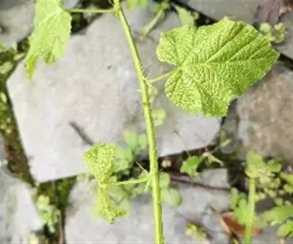 单叶宽卵形,稀长圆状卵形,长5-10(12)厘米,宽a1-8厘米,顶端渐尖,基部心形,上面疏生柔毛或沿叶脉有柔毛,下面被疏柔毛,沿叶脉毛较密,中脉上常疏生小皮刺,边缘明显3-5裂或呈波状,有细锯齿;叶柄长2-4(5)厘米,具细柔毛或近于无毛,有稀疏小皮刺;托叶离生,线状深裂,有细柔毛或近无毛,常脱落。