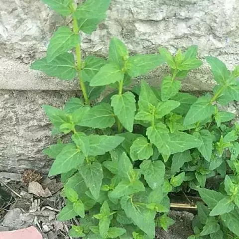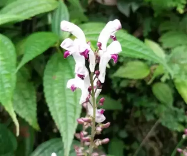 叶通常4对,卵圆形或椭圆状卵圆形,长3—11厘米,宽2—4.5厘米,先端渐尖或短渐尖,基部圆形,边缘疏生极不明显的小齿或浅波状或近全缘,两面无毛,背面密生小凹腺点,侧脉约4对;叶柄水红色,长0.7—1.2厘米,被具腺柔毛。总状花序顶生间或腋生,长9—15厘米,花对生,花梗长2—2.5毫米,与序轴密微柔毛及具腺柔毛;苞片退化。花萼于花时常呈紫红色,长约2毫米,外被微柔毛,盾片开展,半圆形,高1.5毫米。