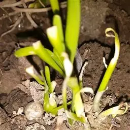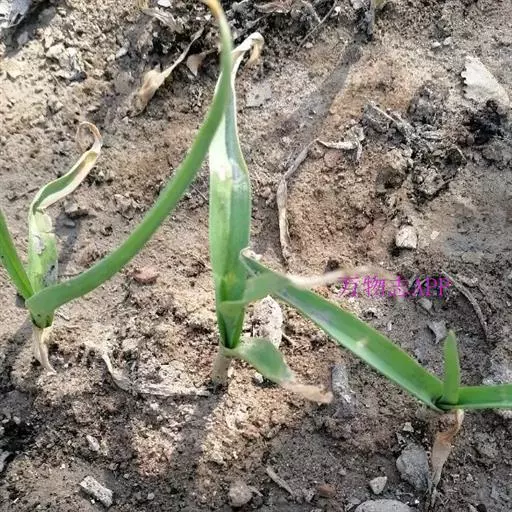4.1叶枯病该病为真菌性病害,病菌主要在病残体上越冬。多雨高温、氮肥过多、过于繁茂的徒长弱苗极易发病。病菌侵染叶片和花梗,一般多从叶尖开始发病,逐渐向下扩展。初生为白色圆形斑点,后扩大为密生黑色粉状霉层,最后叶和梗变黄枯死,并从病部折断。发病严重时,大蒜不易抽薹。防治方法:(1)加强田间管理,提高植株的抗病性。(2)收获后清除病残体并集中处理。(3)喷施75%百菌清可湿性粉剂600倍液,或70%代森锰锌可湿性粉剂500倍液。