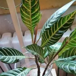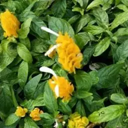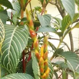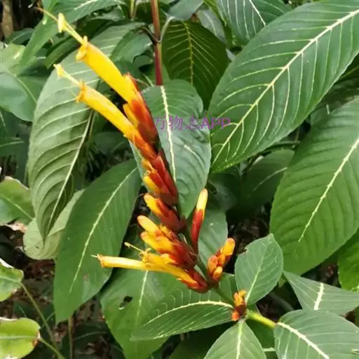 金脉爵床又名金叶木,为爵床科黄脉爵床属多年生常绿观叶植物。株高可达150cm,但盆栽株高一般为50~80cm。叶对生,无叶柄,阔披针形,长15~30cm、宽5~10cm,先端渐尖,基部宽楔形,叶缘有钝锯齿,叶片嫩绿色,叶脉粗壮呈橙黄色。夏秋季开出黄色的花,花为管状,长4~5cm,簇生于短花茎上,每簇 8~10朵,整个花簇为1对鲜红色的苞片包围。