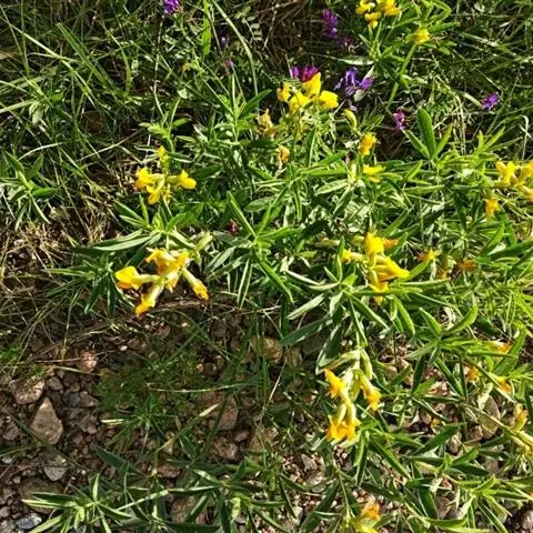 多年生、纤弱多分枝草本,高20-50厘米。无毛,有时有粗厚的根状茎。托叶披针形,长1毫米,无毛,有明显的脉纹,基部具长耳。小叶2枚,卵状长圆形、倒卵形至披针形,长0.8-1.5厘米,有时长达2.5厘米,先端急尖而具短尖头,基部偏斜,两面无毛,背面有褐色或黑色腺点。总状花序腋生,长2-6厘米,花2-6(-10)朵疏生于花序轴上;苞片2,卵形,长6-7(-10)毫米,盾状着生,具缘毛,有明显的纵脉纹5-6条;花萼长3毫米,花冠黄色,旗瓣有纵脉,翼瓣和龙骨瓣均较小,具瓣柄。荚果通常长于苞片,少有短于苞片,有荚节2-6,荚节近圆形,长与宽约2(-4)毫米,表面具明显网脉及针刺。花期4-7月,果期7-9月。
