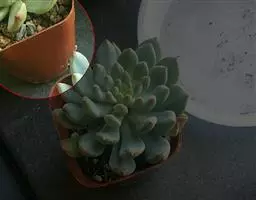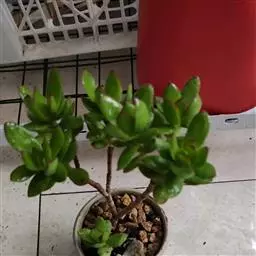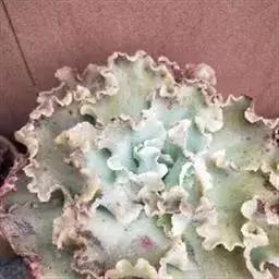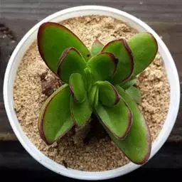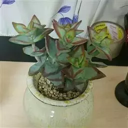 多年生肉质草本植物,植株呈亚灌术状高约60厘米,具小分枝,茎肉质以后稍木质化。肉质叶灰绿至浅绿色,叶缘稍具红色,交互对生,卵圆状三角形,无叶柄,基部连在一起,幼叶上下叠生,战叶上下有少许间隔。叶长1.5~2.5厘米,宽0.9~1.3厘米,花白色,4~5月开放。