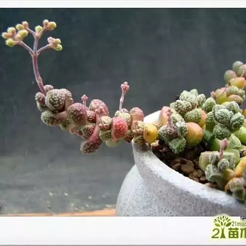 生长期宜保持土壤湿润,避免积水,否则会造成植株根、基部腐烂。每15天左右施一次腐熟的稀薄液肥,以促进植株的生长。冬季放在室内阳光处,如果能维持10℃以上,可继续浇水,酌情施些肥,使植株继续生长;如果保持不了这么高的温度,控制浇水,使植株休眠,也能耐5℃左右的低温。夏季高温时植株生长缓慢或完全停止,可放在通风良好处养护,适当遮光,避免烈日曝晒,并停止施肥,节制浇水,也不要长期雨淋,以免植株腐烂。串钱景天在栽培中应经常修剪,剪去过乱的枝条,以保持株形的优美。当植株生长过于拥挤时可在春季或秋季换盆,种植盆应根据植株的大小进行选择,花盆过大或过小都不利于其生长。此外,还要考虑花盆的美观性。盆土要求疏松肥沃,具有良好的排水透气性,可用腐叶土、园土、粗砂或蛭石混合土栽种。