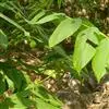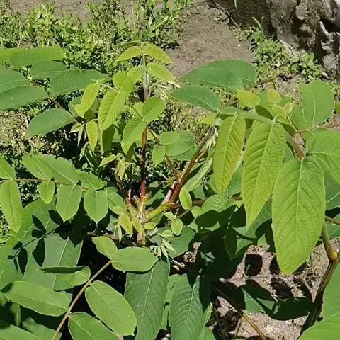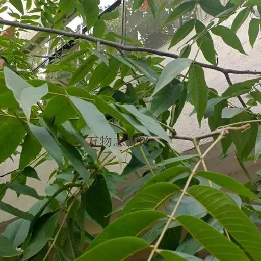 奇数羽状复叶长25-30厘米,叶柄及叶轴幼时被有极短腺毛及腺体;小叶通常5~9枚,稀3枚,椭圆状卵形至长椭圆形,长约6-15厘米,宽约3-6厘米,顶端钝圆或急尖、短渐尖,基部歪斜、近于圆形,边缘全缘或在幼树上者具稀疏细锯齿,上面深绿色,无毛,下面淡绿色,侧脉11-15对,腋内具簇短柔毛,侧生小叶具极短的小叶柄或近无柄,生于下端者较小,顶生小叶常具长约3~6厘米的小叶柄。