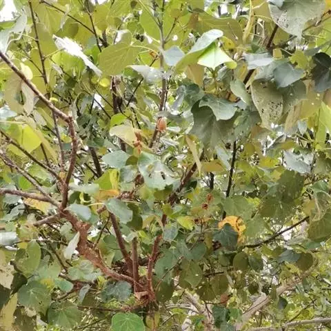 蒴果卵圆形,直径约12毫米,密被黄色星状绒毛;种子肾形,成熟种子黑褐色,背部被黄白色长柔毛。花期7-10月。