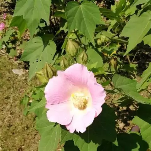 木槿(学名:Hibiscus syriacus Linn.):落叶灌木,高3-4米,小枝密被黄色星状绒毛。叶菱形至三角状卵形,长3-10厘米,宽2-4厘米,具深浅不同的3裂或不裂,先端钝,基部楔形,边缘具不整齐齿缺,下面沿叶脉微被毛或近无毛。花单生于枝端叶腋间,花萼钟形,长14-20毫米,密被星状短绒毛,裂片5,三角形;花朵色彩有纯白、淡粉红、淡紫、紫红等,花形呈钟状,有单瓣、复瓣、重瓣几种。外面疏被纤毛和星状长柔毛。蒴果卵圆形,直径约12毫米,密被黄色星状绒毛;种子肾形,背部被黄白色长柔毛。花期7-10月。