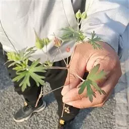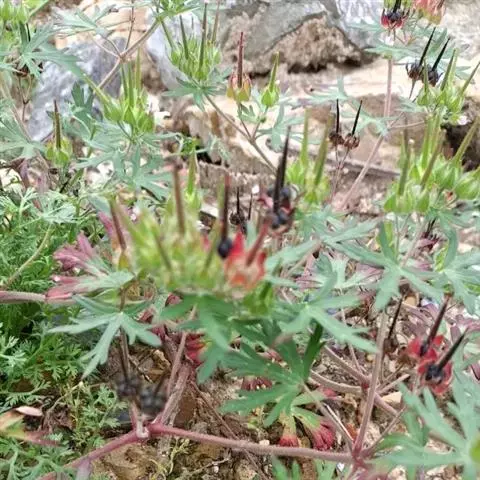 茎纤细,长约30cm,直径lmm~2mm,节间长,具纵皱纹,质较坚脆,易折断,断面纤维性,空心。叶对生,叶片卷曲皱缩,质脆易碎,湿润展平后为五角状圆形,3~5全裂,全裂片又再涂羽裂,中央全裂片有长柄,侧生全裂片有短柄。花紫红色。果实长圆形,长约2cm,有宿存的花柱及红紫色花萼,成熟后5裂,各与l枚种子相连,并向外反卷或卷曲成螺旋形。无臭,味淡。以色灰绿、果实多,无根及泥土者为佳。