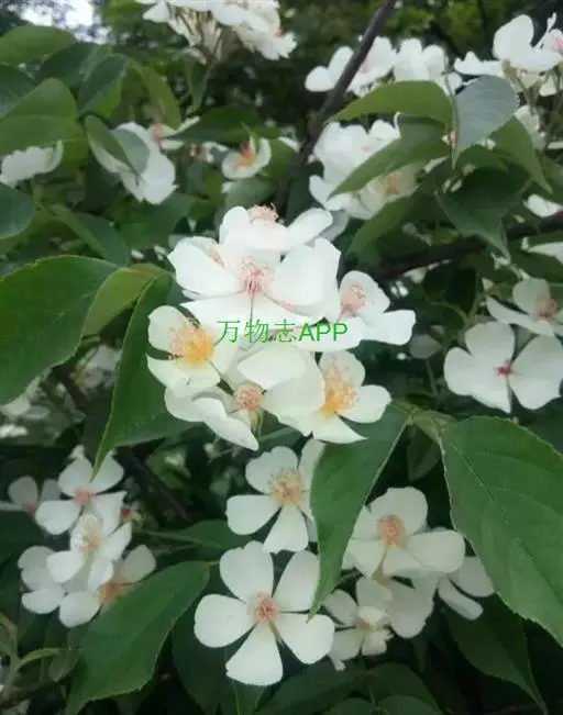 攀援灌木;小枝圆柱形,通常无毛,有短、粗稍弯曲皮束。小叶5-9,近花序的小叶有时3,连叶柄长5-10厘米;小叶片倒卵形、长圆形或卵形,长1.5-5厘米,宽8-28毫米,先端急尖或圆钝,基部近圆形或楔形,边缘有尖锐单锯齿,稀混有重锯齿,上面无毛,下面有柔毛;小叶柄和叶轴有柔毛或无毛,有散生腺毛;托叶篦齿状,大部贴生于叶柄,边缘有或无腺毛。花多朵,排成圆锥状花序,花梗长1.5-2.5厘米,无毛或有腺毛,有时基部有篦齿状小苞片;花直径1.5-2厘米,萼片披针形,有时中部具2个线形裂片,外面无毛,内面有柔毛;花瓣白色,宽倒卵形,先端微凹,基部楔形;花柱结合成束,无毛,比雄蕊稍长。果近球形,直径6-8毫米,红褐色或紫褐色,有光泽,无毛,萼片脱落。