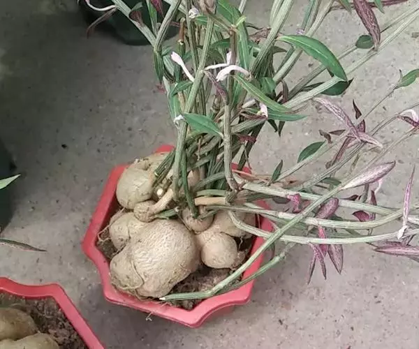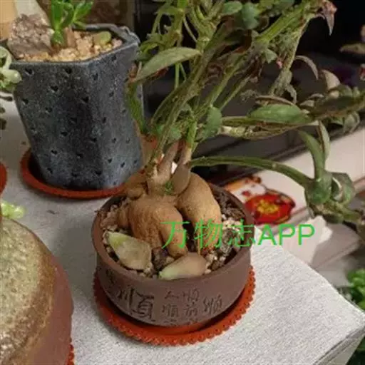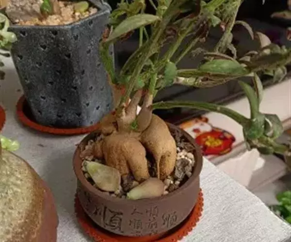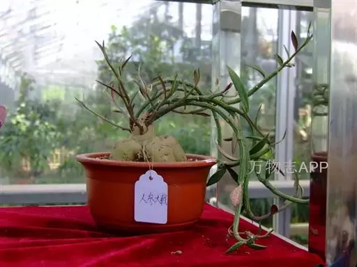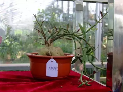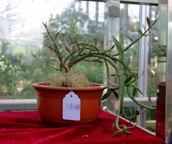 人参大戟可称为“三观”植物,即:观花、观叶、观根。尤其是人参大戟的根茎可于“人参榕”媲美。人参大戟,茎干状多肉花卉。植株茎基膨大,呈球状、地瓜状或形似人参, 表皮灰白色至黄褐色。其顶端长有细柱状的茎。分支横斜生长,表皮褐、绿色,有灰白色纵向条纹。叶片椭圆形,,正面青绿色带紫晕,背面紫红色,有淡绿色花纹,交互对生。花期夏、秋季,小花粉红色,生在茎、叶腋间。