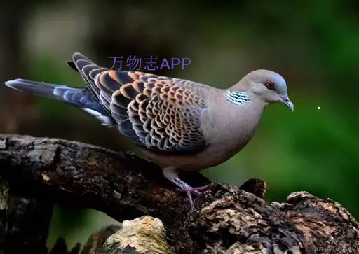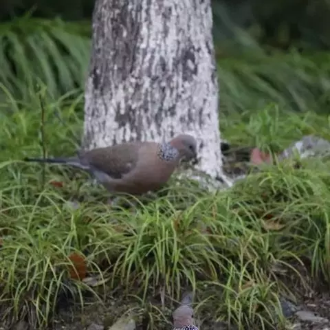 山斑鸠,是鸽形目鸽鸠科斑鸠属鸟类,又名金背斑鸠、棕背斑鸠、山鸠、金背鸠、麒麟斑、麒麟鸠、东方斑鸠、绿斑鸠、山鸽子。山斑鸠颈侧具明显黑白色条纹的块状斑,上体深褐色、具扇贝状斑纹,羽缘棕色,尾羽近黑色,下体多偏粉色。虹膜黄色,喙灰色,脚粉色。山斑鸠是留鸟,在中国常见且分布广泛。此外,还分布于不丹、尼泊尔、巴基斯坦、印度、日本等国。栖息于针阔混交林、季风常绿阔叶林、果园及农耕区,多成对活动于开阔农耕区、村舍、寺院周围及防火林带。取食于地面,主要觅食植物种子、果实、嫩芽等,也吃昆虫。山斑鸠飞翔时鼓翼快速,叫声为反复而低沉的“咕咕咕”声。繁殖期在4-7月,营巢于林中树上,通常一年繁殖2窝,窝卵数2枚,由雌雄亲鸟轮流孵卵,孵化期18~19天。山斑鸠的肉、卵可食,肉入药可益气明目、强筋壮骨,治久病气虚、衰弱无力、两目昏暗等病症。山斑鸠啄食杂草种子,对农田清除杂草有益;但有时也刨食农作物及树的种子。山斑鸠