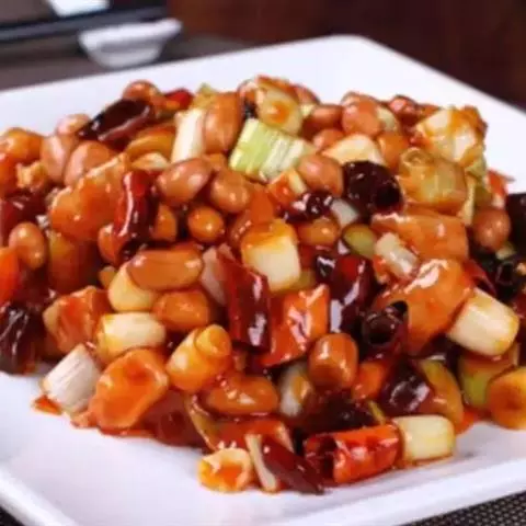宫保鸡丁选用鸡肉为主料,佐以花生米、黄瓜、辣椒等辅料烹制而成。 红而不辣、辣而不猛、香辣味浓、肉质滑脆。由于其入口鲜辣,鸡肉的鲜嫩配合花生的香脆。