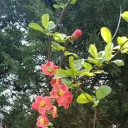 直立灌木,小叶片宽卵形至卵状长圆形,边缘有锐锯齿,两面近无毛,上面暗绿色,常带光泽,下面颜色较浅,花几朵集生,稀单生,萼片卵形,稀全缘;花瓣重瓣至半重瓣,红色、粉红色至白色,倒卵形,先端有凹缺,基部楔形;花柱离生,伸出萼筒口外,约与雄蕊等长。果卵球形或梨形,长1-2厘米,红色,萼片脱落。