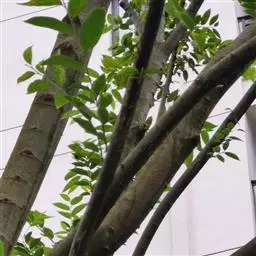 大苗定植:当树苗长到1.8-2米高时即可定植至庭院、厂矿或街坊,定植处应挖长宽均为50-60厘米、深50厘米的坑,挖出的生土、熟土各放一旁,定植树苗带土球移入土坑内,栽植后先盖熟土,最后盖生土。有条件的地方,在定植前,先在坑内施腐熟有机肥,用量为2-3千克/坑,盖上一层熟土后,再移栽树苗。盖好土后应立即浇1次透水,以后每3-5天浇水1次,直到成活为止。如遇雨天,应及时做好排水工作,以确保定植树成活,进入正常生长发育。