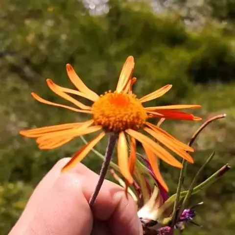 头状花序下部的叶更小,常羽状全裂。全部叶末回裂片椭圆形、长椭圆形或斜三角形,两面有稀疏的毛或无毛。头状花序单生茎顶或茎生2个头状花序。总苞宽10-15毫米。总苞片约4层。外层披针形,长3.5毫米,被短毛或无毛。中内层长椭圆形至线状倒披针形,长约5毫米,无毛。全部苞片边缘浅褐色膜质。舌状花红色,舌片长约16毫米,宽3-4毫米,长椭圆形,顶端2-3齿裂。