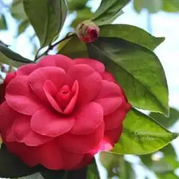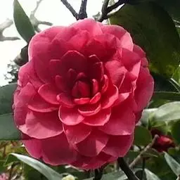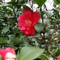 滇山茶(学名:Camellia reticulata Lindl.):灌木至小乔木,有时高达15米,嫩枝无毛。叶阔椭圆形,上面干后深绿色,发亮,下面深褐色,无毛,侧脉6-7对,边缘有细锯齿。花顶生,红色,直径10厘米,无柄;苞片及萼片10-11片,花瓣红色,6-7片,最外1片近似萼片,倒卵圆形,长2.5厘米,背有黄绢毛,其余各片倒卵圆形。蒴果扁球形,高4.5厘米,宽5.5厘米,3爿裂开,果爿厚7毫米,种子卵球形,长约1.5厘米。