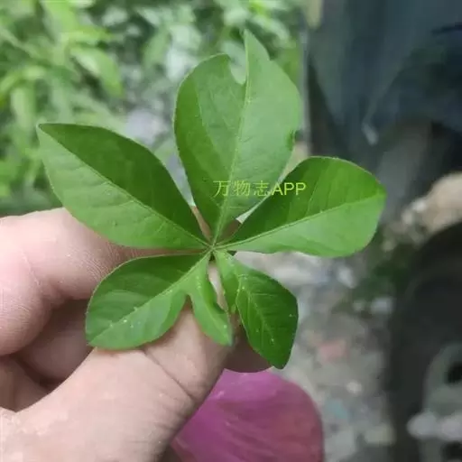叶掌状5深裂或全裂,裂片卵状披针形、卵形或椭圆形,中裂片较大,长4-5厘米,宽2-2.5厘米,两侧裂片稍小,顶端渐尖或稍钝,具小短尖头,基部楔形渐狭,全缘或不规则微波状,基部1对裂片通常再2裂;叶柄长2-8厘米,基部具小的掌状5裂的假托叶(腋生短枝的叶片)。