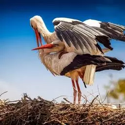 白鹳(英文名称:White Stork)是欧洲白鹳和东方白鹳的通称。属大型涉禽。其羽毛以白色为主,翅膀具黑羽,成鸟具细长的红腿和细长的红喙。共有三个亚种,大小略有不同。嘴长而粗壮,在高树或岩石上筑大型的巢,飞时头颈伸直。白鹳在欧洲是非常有名的鸟,常常在屋顶或烟囱上筑巢。为食肉动物,其食性广,包括昆虫,鱼类,两栖类,爬行类,小型哺乳动物和小鸟。觅食地大部分为具低矮植被的浅水区。一夫一妻制,但非终生。雌鸟通常每年产4枚卵,孵化需33-34天,58-64天后出巢。