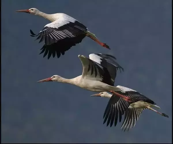 白鹳是迁徙性鸟类,主要迁往热带非洲和印度次大陆一带越冬。迁徙主要依靠上升的热气流进行高空滑翔运动,从而可利用很少的能量,进行长距离迁徙,因此常常避开广阔的森林和水域,如果一定要经过时,也要寻找最为狭窄的地方通过。迁徙的时间大多在上午至下午天气最热的时候,每天迁徙的距离可达100-200公里。在地上起飞时,要先在地上奔跑一段距离,并用力地煽动翅膀,待获得一定的上升力后才能飞起。飞行时头颈向前伸直,脚伸向后,远远突出于尾羽的外面。既能煽动两翅进行鼓翼飞翔,也能利用上升的热气流在高空滑翔,特别是迁徙期间,在进行鼓翼飞翔时两翅煽动较慢,显得从容不迫,并常常和滑翔交替进行。两翅鼓动速度为每分钟170次,飞行速度达每小时40-47公里,飞行高度可达1600米以上至3600米的高空,在迁徙期间甚至出现在4300米的喜马拉雅山上空。从欧洲繁殖地迁往南非越冬地,最远的迁徙距离往返可达20000多公里以上。在德国曾经记录到一只25岁的欧洲白鹳,在一生中总计迁徙了大约500,000多公里的距离。秋季大多在8月中下旬至9月初迁离繁殖地,春季于3-4月离开越冬地。迁徙时集成大群,每群常在500只以上,最高记录为21000多只。