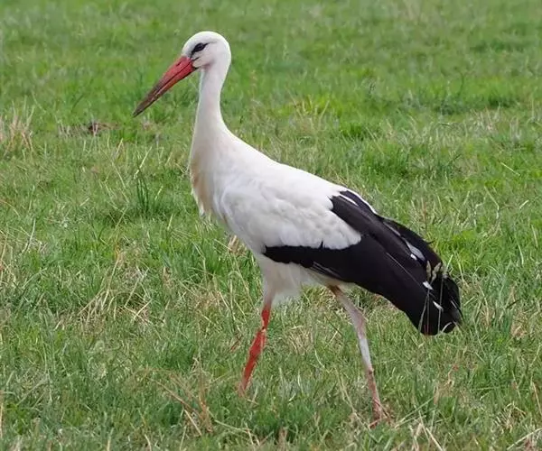 白鹳为大型鸟类,体长90-115厘米,翼展195-215厘米,体重3000-3500克。寿命26年。翅膀长且宽,可滑翔。飞行时,脖子向前伸,腿向后伸,超出其尾尖。与其他鹳鸟类似,其腿、颈和喙都非常细长。羽毛主要为白色,翅膀处具黑羽。主翼羽、副翼羽、初级覆羽、上翼大覆羽、肩羽、小翼羽为黑色,具绿色或紫色光泽。初级飞羽基部白色,内侧初级飞羽和次级飞羽外侧羽缘和羽尖外,均为银灰色,向内逐渐转为黑色。前颈下部有呈披针形的长羽,在求偶期间能竖直起来。鸟喙为红色,喙形较直,不向上翘,嘴基较厚,往尖端逐渐变细。眼周、眼先和喉部的裸露皮肤均为黑色,虹膜为褐色或灰色,眼眶周围的皮肤为黑色。成鸟腿为鲜红色。雌雄两性在外观上完全相同,只是一般雄性体型大于雌性。幼鸟羽毛浅棕色、灰暗,鸟喙、眼周、眼先和喉为黑色。 [1-2]