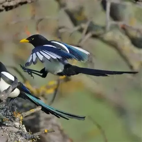 喜鹊:是鸦科、鹊属的一种鸟类。共有11个亚种。体长40-50厘米,雌雄羽色相似,…