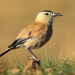 黑尾地鸦:体羽沙褐色,额、头顶以至后颈呈发金属紫蓝辉的黑色。头侧乳黄色。整个背面,包括两肩葡萄褐色。…