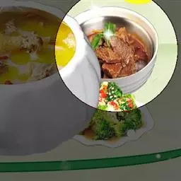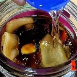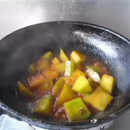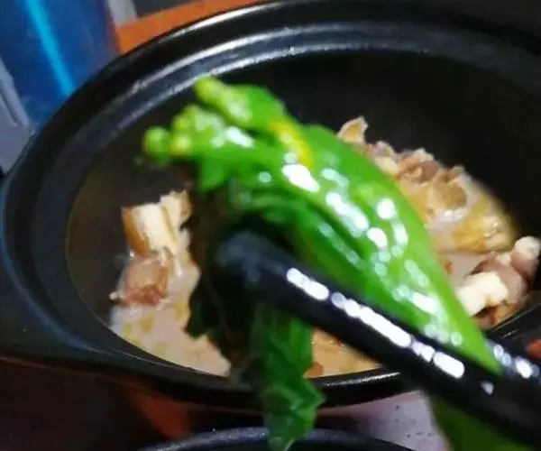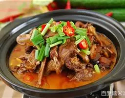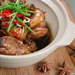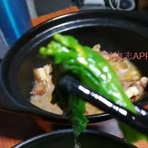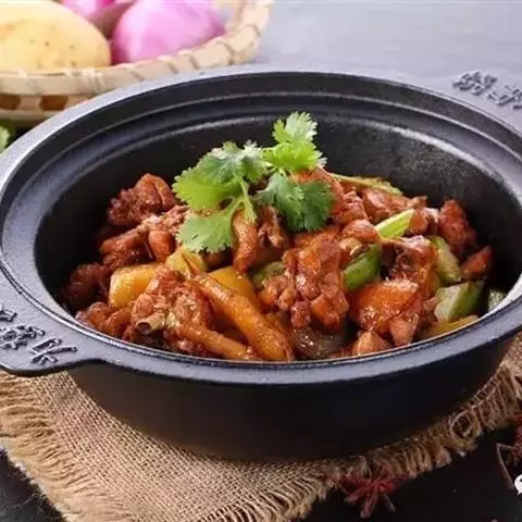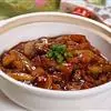 4. 烧热瓦缸下油,放入青蒜、肉排同爆,下些老抽,一碗清水,适量味精、糖、盐同煲之,煲十分钟后,加入已熟之粟子焖片刻即成。