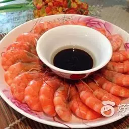 3、用旺火把清水烧开,下入鲜虾淖至熟捞起,控去水分上盘便可,跟味碟上桌。 [3-4]