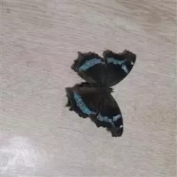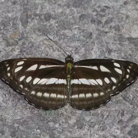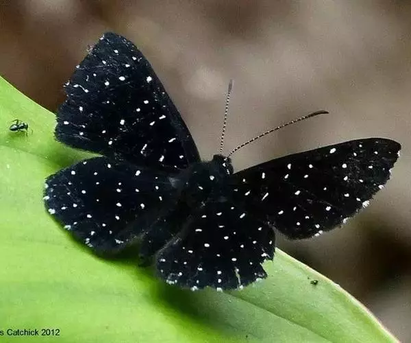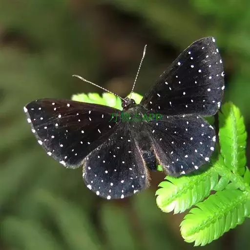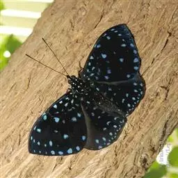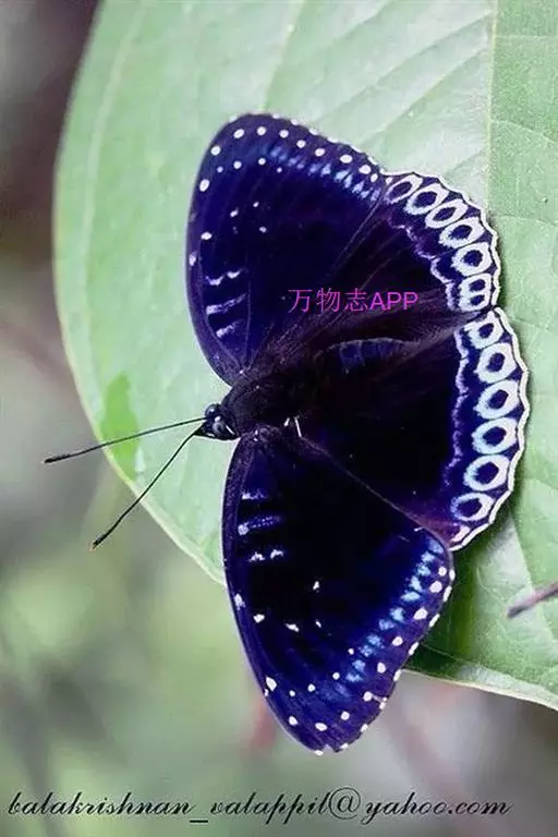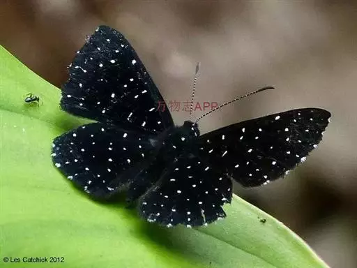 翅展55mm左右。翅面黑色,反面棕褐色。前翅外缘有1列整 齐的小白斑,其中2a室有2个,亚外缘有1列小白点,上述2列白点间有1条蓝色线。中室内有3条蓝白色短线,中室外侧也有数个小白点,后翅外侧也有数个小白点。后翅外缘有1列白斑,白斑内侧有1列黑点和蓝色带。反而斑点同正面,且更清晰。