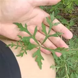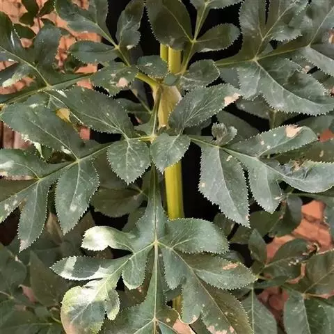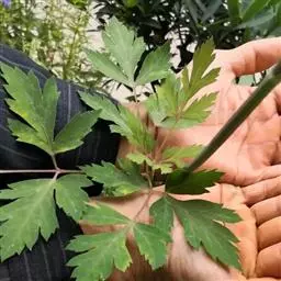 叶柄长2-7厘米,下部有窄膜质的叶鞘;叶片长卵形,1-2回羽状分裂,两面疏生紧贴的粗毛,第一回羽片卵状披针形,长2-6厘米,宽1-2.5厘米,先端渐窄,边缘羽状深裂至全缘,有0.5-2厘米长的短柄,末回裂片披针形以至长圆形,边缘有条裂状的粗齿至缺刻或分裂。