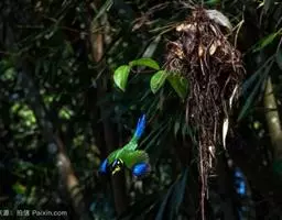 蓝翅叶鹎:小型鸟类,体长15-18厘米。雄鸟通体草绿色,尾蓝绿色,肩和翅亮蓝 色,胸缀有黄色,…