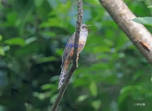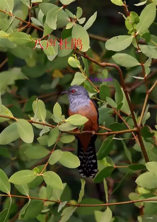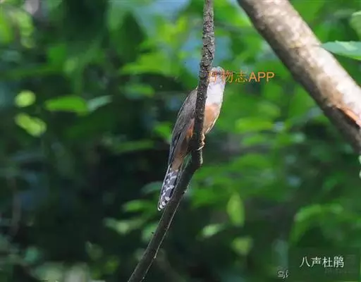 八声杜鹃(学名:Cacomantis merulinus)小型鸟类,体长21~25厘米。嘴形侧扁、尖削。雄鸟头、颈和上胸灰色,背至尾暗灰色,尾具白色端斑。胸以下淡棕栗色,上下体均无横斑。叫声为八声一度。雌鸟通体为灰黑色和栗色相间。相似种棕腹杜鹃体型较大,尾具黑色横斑和红褐色端斑,胸、腹棕栗色,腹以下白色,区别甚明显,野外不难辨别。