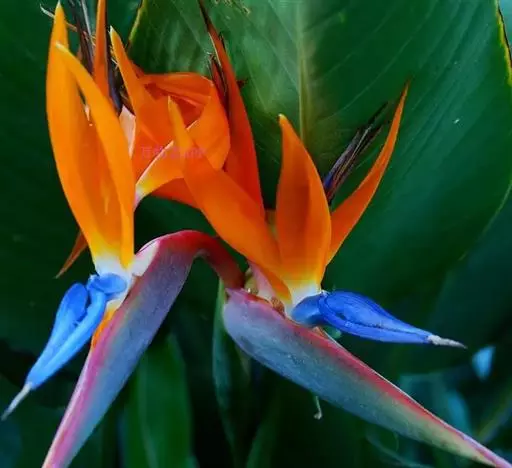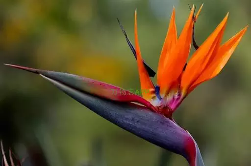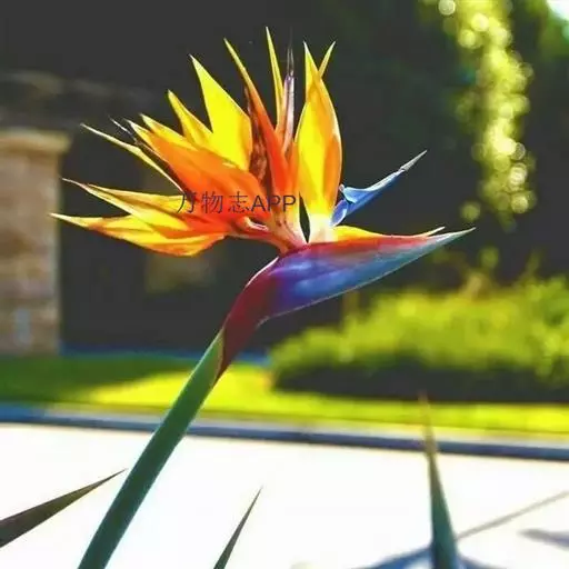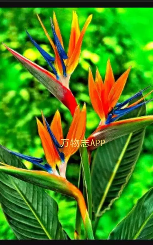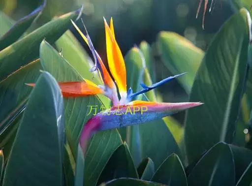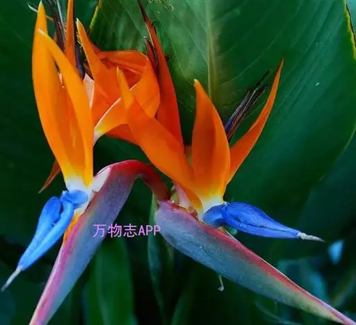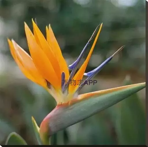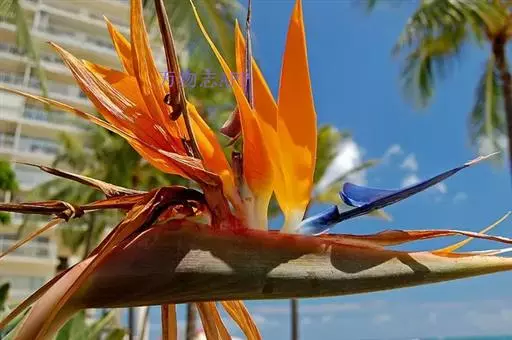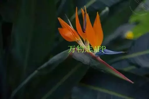 鹤望兰(Strelitzia reginae Aiton)芭蕉科鹤望兰亚科 多年生草本植物,无茎。叶片长圆状披针形,长25-45cm,宽10cm。叶片顶端急尖;叶柄细长。花数朵生于总花梗上,下托一佛焰苞;佛焰苞绿色,边紫红,萼片橙黄色,花瓣暗蓝色;雄蕊与花瓣等长;花药狭线形,花柱突出,柱头3。花期在冬季。