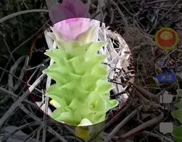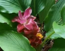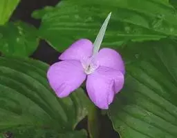 花数朵生于一约与叶柄等长或略短的总花梗上,下托一佛焰苞;佛焰苞舟状,长达20厘米,绿色,边紫红,萼片披针形,长7.5-10厘米,橙黄色,箭头状花瓣基部具耳状裂片,和萼片近等长,暗蓝色;雄蕊与花瓣等长;花药狭线形,花柱突出,柱头3。