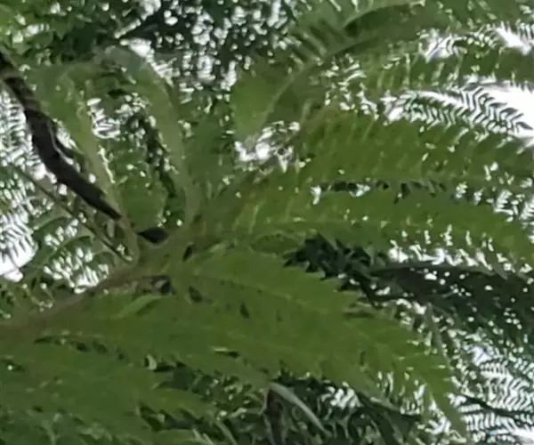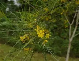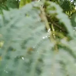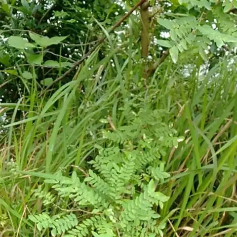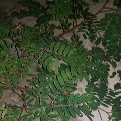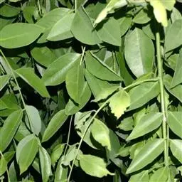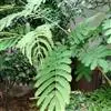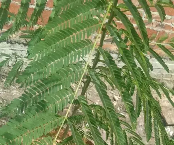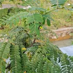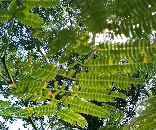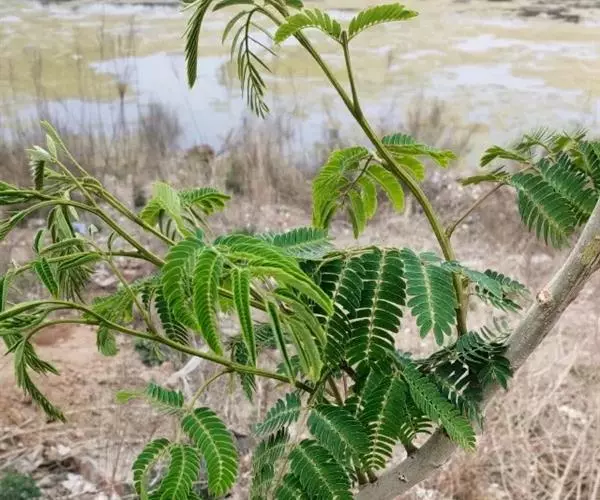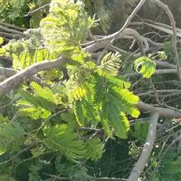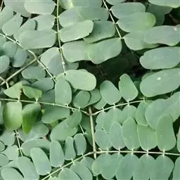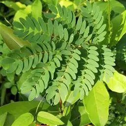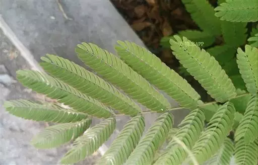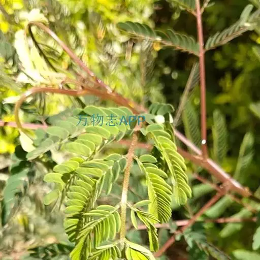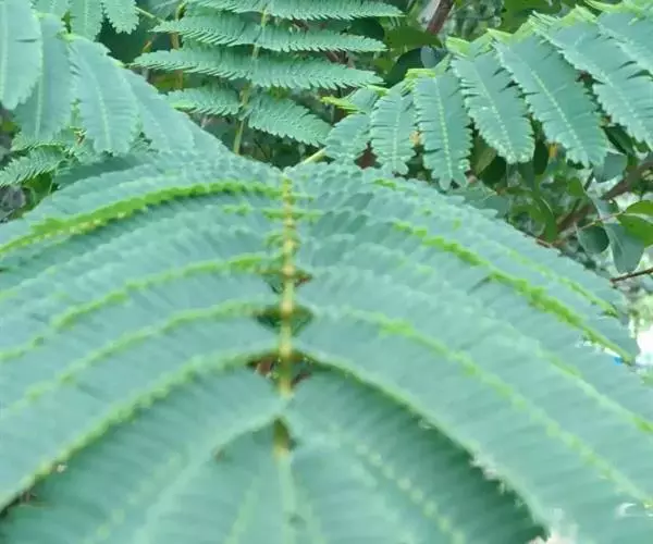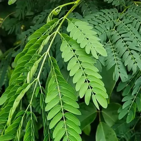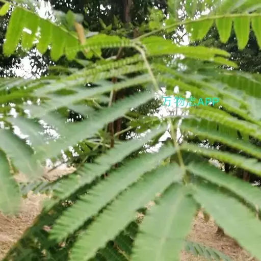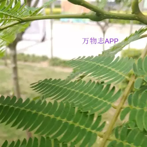 二回羽状复叶,总叶柄近基部及最顶一对羽片着生处各有1枚腺体;羽片4-12对,栽培的有时达20对;小叶10-30对,线形至长圆形,长6-12mm,宽1-4mm,向上偏斜,先端有小尖头,有缘毛,有时在下面或仅中脉上有短柔毛;中脉紧靠上边缘。