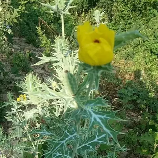 一年生草本(栽培者常为多年生、灌木状),通常粗壮,高30-100厘米。茎具分枝和多短枝,疏被黄揭色平展的刺。基生叶密聚,叶片宽倒披针形、倒卵形或椭圆形,长5-20厘米,宽2.5-7.5厘米,先端急尖,基部楔形,边缘羽状深裂,裂片具波状齿,齿端具尖刺,两面无毛,沿脉散生尖刺,表面绿色,沿脉两侧灰白色,背面灰绿色;叶柄长0.5-1厘米;茎生叶互生,与基生叶同形,但上部叶较小,无柄,常半抱茎。花单生于短枝顶,有时似少花的聚伞花序;花梗极短。花芽卵形,长约1.5厘米;萼片2,舟状,长约1厘米,先端具距,距尖成刺,外面无毛或散生刺,花开时即脱落;花瓣6,宽倒卵形,长1.7-3厘米,先端圆,基部宽楔形,黄色或橙黄色;花丝长约7毫米,花药狭长圆形,长1.5-2毫米,开裂后弯成半圆形至圆形;子房椭圆形或长圆形,长0.7-1厘米,被黄褐色伸展的刺,花柱极短,柱头4-6裂,深红色。蒴果长圆形或宽椭圆形,长2.5-5厘米,宽1.5-3厘米,疏被黄褐色的刺,4-6瓣自顶端开裂至全长的1/4-1/3。种子球形,直径1.5-2毫米,具明显的网纹。花果期3-10月。