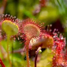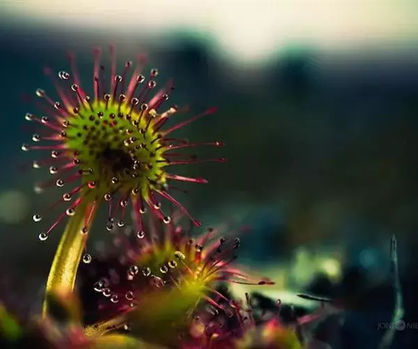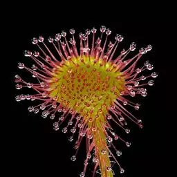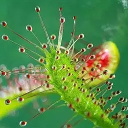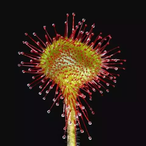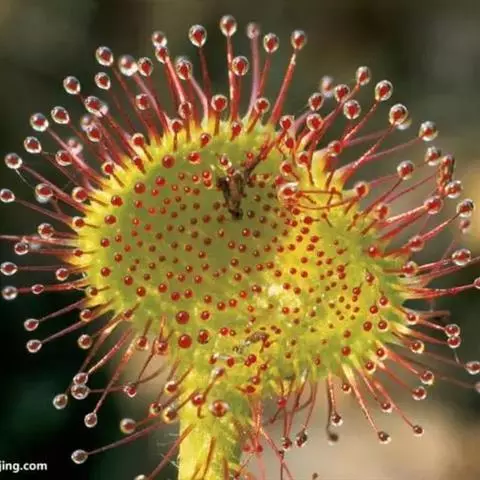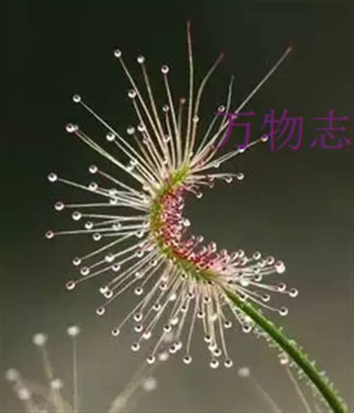 茅膏菜是食虫植物中的一个大类,它们形态各异,分布于世界各地。它的叶片密布着晶莹剔透的“露珠”,光彩夺目,深受人们喜爱。然而,对它的猎物而言,这些耀眼的光芒却是“致命”的,因为茅膏菜正是通过这些“露珠”来进行捕猎的。
