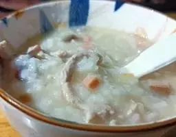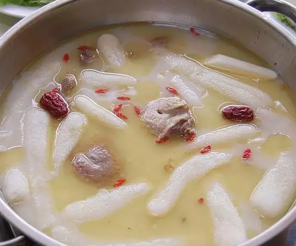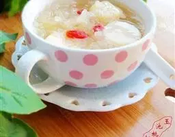 制法:将鹅肉、猪肉分别洗净,放入沸水锅中氽透,捞出,沥干水,切成丝,待用。把淮山药、北沙参、玉竹分别去杂,清水洗净,装入纱布袋中扎口,待用。将煮锅刷洗干净,置于火上,注入鸡汤,放入鹅肉丝、猪肉丝、药袋、精盐、料酒、胡椒粉、生姜片,锅加盖,共煮至肉熟烂,淋上鸡油,以味精调味即成。