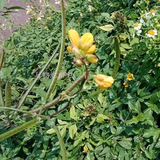 花数朵组成伞房状总状花序,腋生和顶生,长约5厘米;苞片线状披针形或长卵形,长渐尖,早脱;花长约2厘米;萼片不等大,外生的近圆形,长6毫米,内生的卵形,长8-9毫米;花瓣黄色,外生的卵形,长约15毫米,宽9-10毫米,其余可长达20毫米,宽15毫米,顶端圆形,均有短狭的瓣柄;雄蕊7枚发育,3枚不育,无花药。荚果带状镰形,褐色,压扁,长10-13厘米,宽8-9毫来,稍弯曲,边较淡色,加厚,有尖头;果柄长1-1.5厘米;种子30-40颗,种子间有薄隔膜。