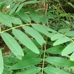 直立、少分枝的亚灌木或灌木,无毛,高0.8-1.5米;枝带草质,有棱;根黑色。叶长约20厘米;叶柄近基部有大而带褐色、圆锥形的腺体1枚;小叶4-5对,膜质,卵形至卵状披针形,长4-9厘米,宽2-3.5厘米,顶端渐尖,有小缘毛;小叶柄长1-1.5毫米,揉之有腐败气味;托叶膜质,卵状披针形,早落。