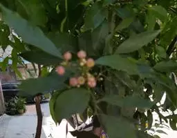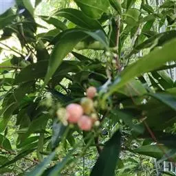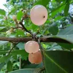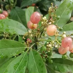 果圆球形或椭圆形,径10—15毫米,淡黄白色转淡红色或暗朱红色,半透明,油点明显,有种子3—2、稀1粒、花期3一5月,果期7—9月。通常除冬、春初季节外常在同一树上有成熟果也同时开花。 [1-2]